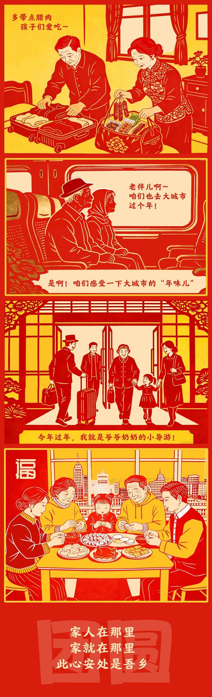 反向春运,远不止出行方式之变,它见证着中国人对“家”的理解,从故土坐标转向亲情纽带。变的,是团圆路径的智慧选择;不变的,是对亲情的永恒珍视。一个充满活力的现代社会,正以其包容与温度,为每一种真挚奔赴铺就道路。流动中国的底色是团圆,动力是亲情,终点永远是家之所在。(文字/泰轩萍 漫画/泰轩萍 )